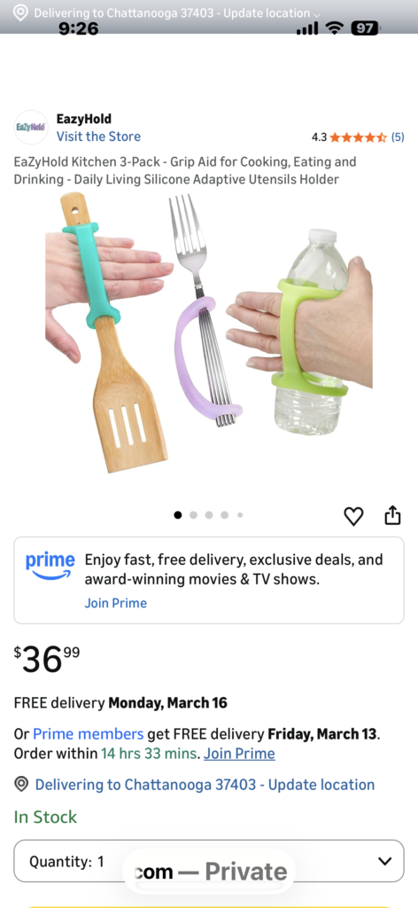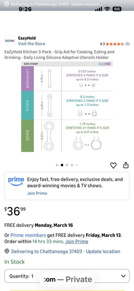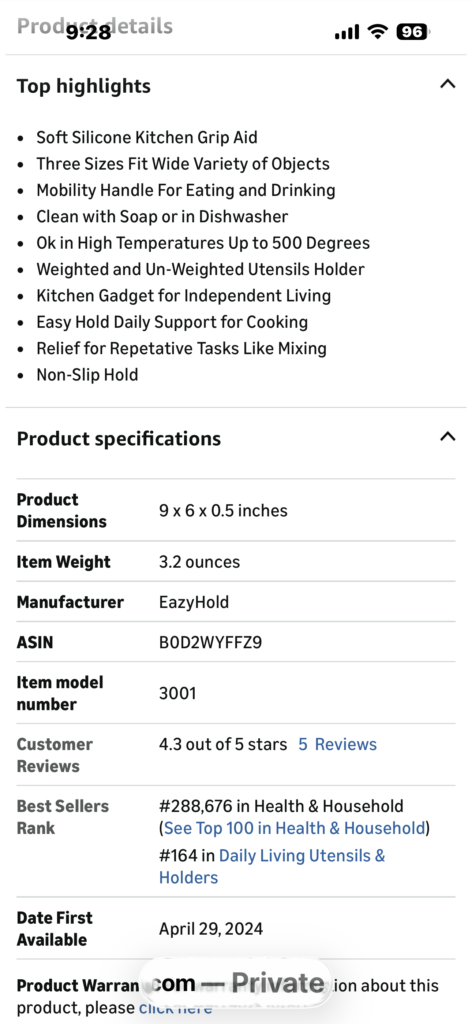 I absolutely love this product. It is so extremely useful in a variety of ways. One of my most favorite ways to use it is with my water bottles. I also use it with glasses, kitchen, tools, and knives. It provides such a great way to hold onto something, so much more securely than it would otherwise it also allows for me to hold onto something with one hand vs both. I love that these bypass my fingers, and lay some nicely on the back of my hands. They do not slip at all. I would highly recommend these. Very useful.