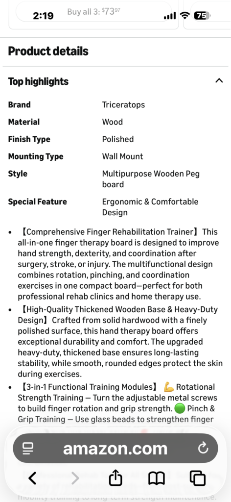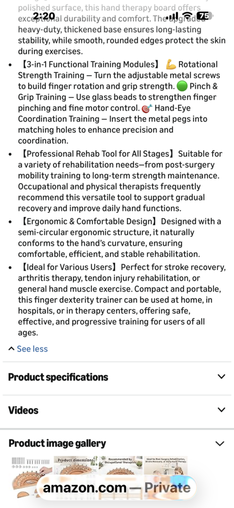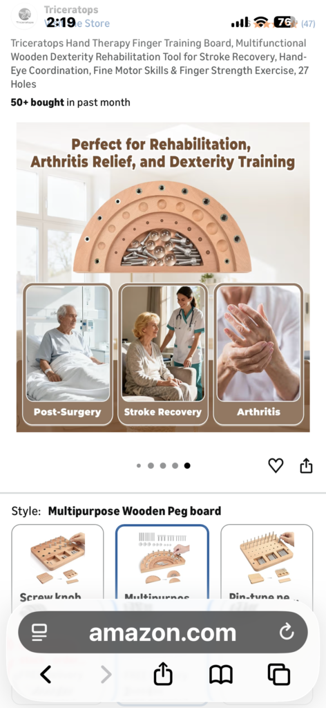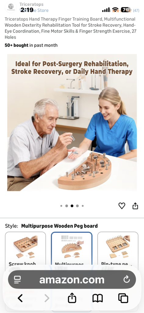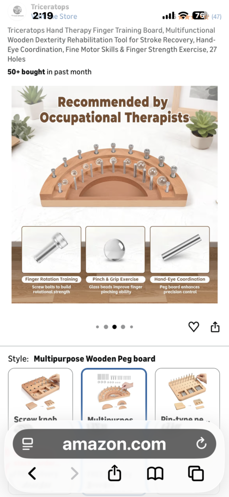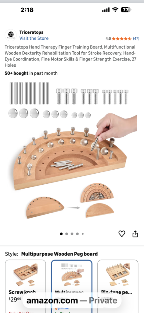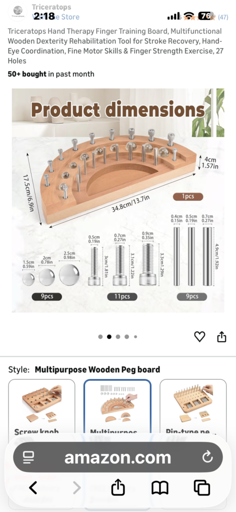 This is an awesome tool to use for a variety of reasons. I really like this tool for daily hand exercises, and trying to improve my fine motor skills. There are different size gadgets/pieces that you use for development of different kinds of things, such as eye-hand coordination and stroke rehabilitation.
